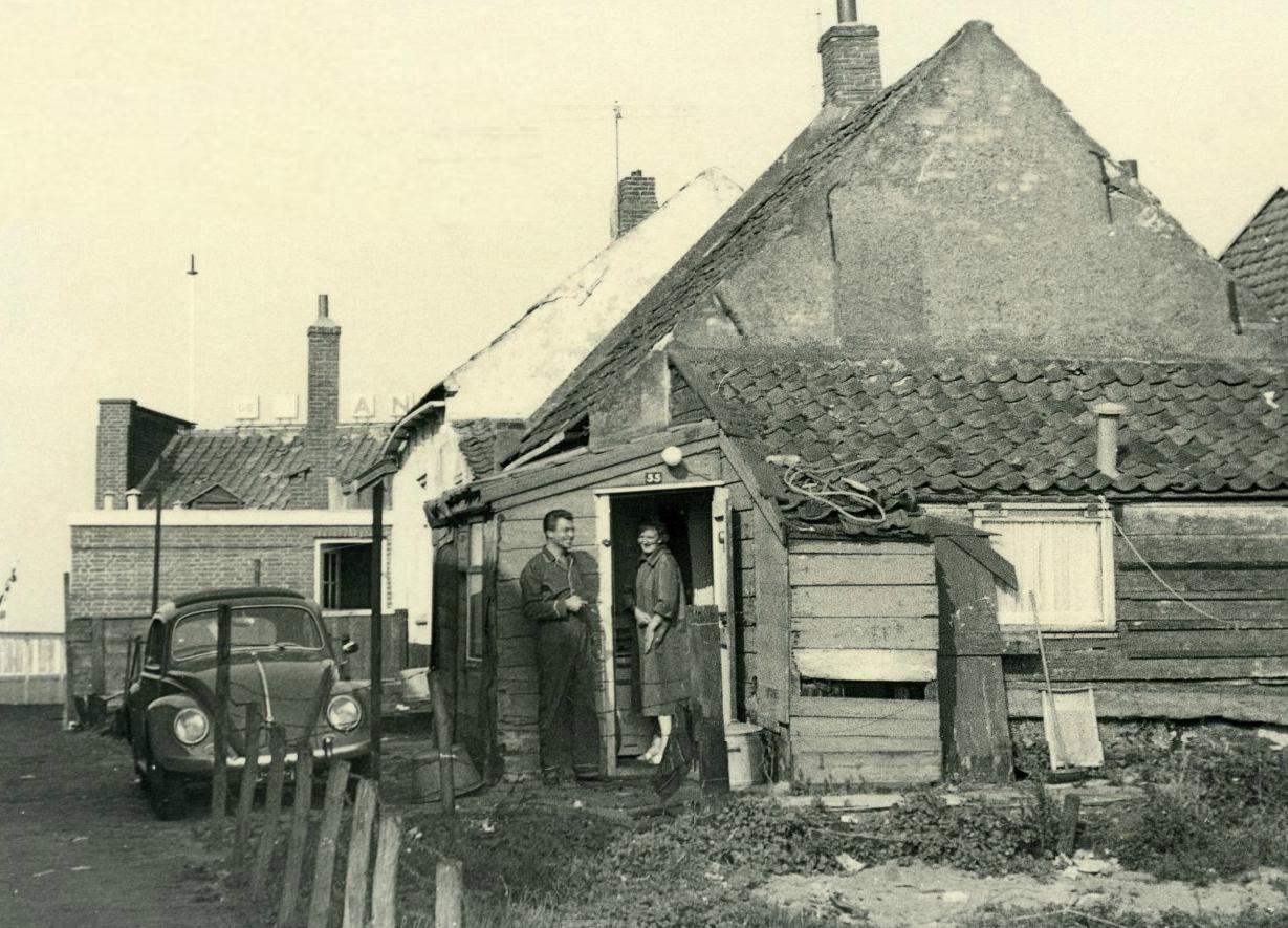 Zo oud als het huisje was, het had nog wel een huisnummer (55) en een lamp boven de deur. En er stond een Volkspiepop het erf. Als het huisje niet achter de beschutting van restaurant “De Landbouw” had gestaan, was het al drie keer weggewaaid in de stormen uit zee. Een storm zou trouwens een vorm van ‘overkill’ zijn geweest. Als je de deur hard achter je dichtsloeg, vlogen de planken waarschijnlijk ook al in het rond. Dat weerhield de bewoners er allemaal niet van gelukkig te wezen. De vrolijkheid straalt tenminste van hun gezichten. Twee keer klikken op de foto en de lol wordt alleen maar groter.