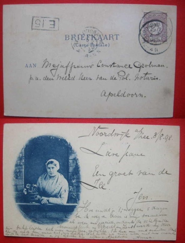 Noordwijk aan Zee, 8/8/98. Lieve Jeane, een groet van de zee, Jen. Hoe vindt je ‘t? Nog geen 5 dagen ben ik weg en daar is mijn ….. me al weer nagereisd en danke de schitterende kroningsfeesten in Utrecht en Zeist werd hij door zijn trekpleister toch weer naar zee getrokken…………. (kaart te koop op marktplaats.nl)