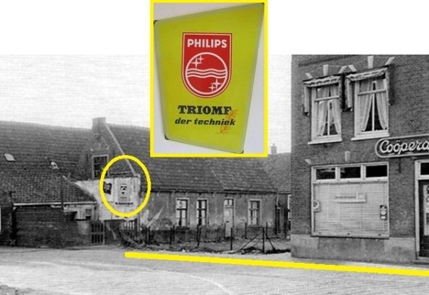 Het krot betreft een zogenoemde “onbewoonbaar verklaarde woning” (wij zeiden: “een onverklaarbaar bewoonde woning”). Ik weet niet of er nog iemand woonde, in dat huis en in die tijd. Maar curieus zijn in ieder geval de reclameborden op de zijgevel. Eén ervan is van Philips. ‘Triomf der Techniek’ staat erop. Maar alle triomfantelijkheid slaat natuurlijk onmiddellijk dood, als je dat van dit soort muren schreeuwt. Dat zal Philips niet bedoeld hebben.