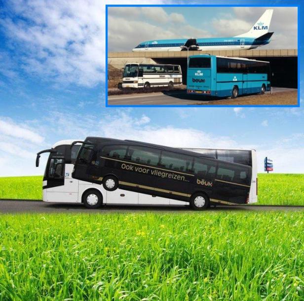 Vroeger (zie inzet) werkten Beuk en KLM wel samen, maar de KLM beperkte zich tot vliegen en Beuk tot rijden. Hoewel. Dat was ook niet altijd zeker: bij de touringcar aan de rechterzijde van de weg is al niet meer duidelijk wie hier rijdt: Beuk of KLM.