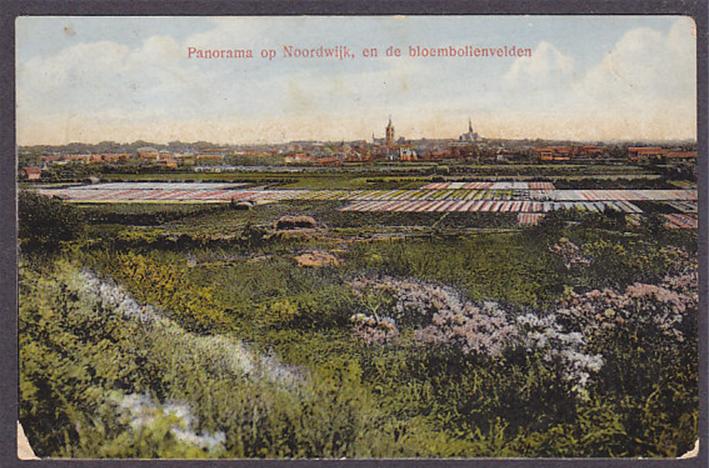 De foto is genomen vanaf de Prins Hendrikweg schat ik in, vóór 1924, want de kattelieke kerk van Noordwijk Binnen is nog niet helemaal afgebouwd. Het frisse voorjaar met bloeiende tulpenvelden, ietwat kunstmatig in beeld gebracht door de zwart-wit foto naderhand met kleur te bewerken. Vooral het gedetailleerde motief van verschillende soorten naast elkaar vooraan valt daarbij op. Dat motief is nogal onwaarachtig: er was geen tulpenboer die zijn verschillende soorten zo dicht bij elkaar en door elkaar zette. Behalve dan misschien in anderhalve proeftuin van gladiolen of dahlia’s. Maar daarvan is in ieder geval op deze foto geen sprake.