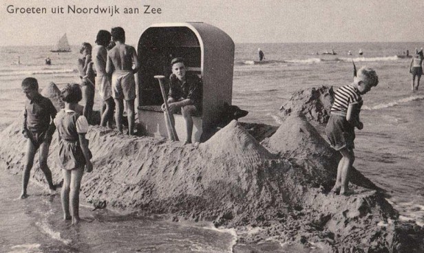 Ik geloof niet dat dit Noordwijk is, want ik geloof niet dat er in Noordwijk ooit zulke strandstoelen hebben gestaan. Er waren houten hokjes met een tentzeilen dak en er waren rieten strandstoelen, maar niet van deze op hun achterste gezette bomschuitjes. Niet in Noordwijk.