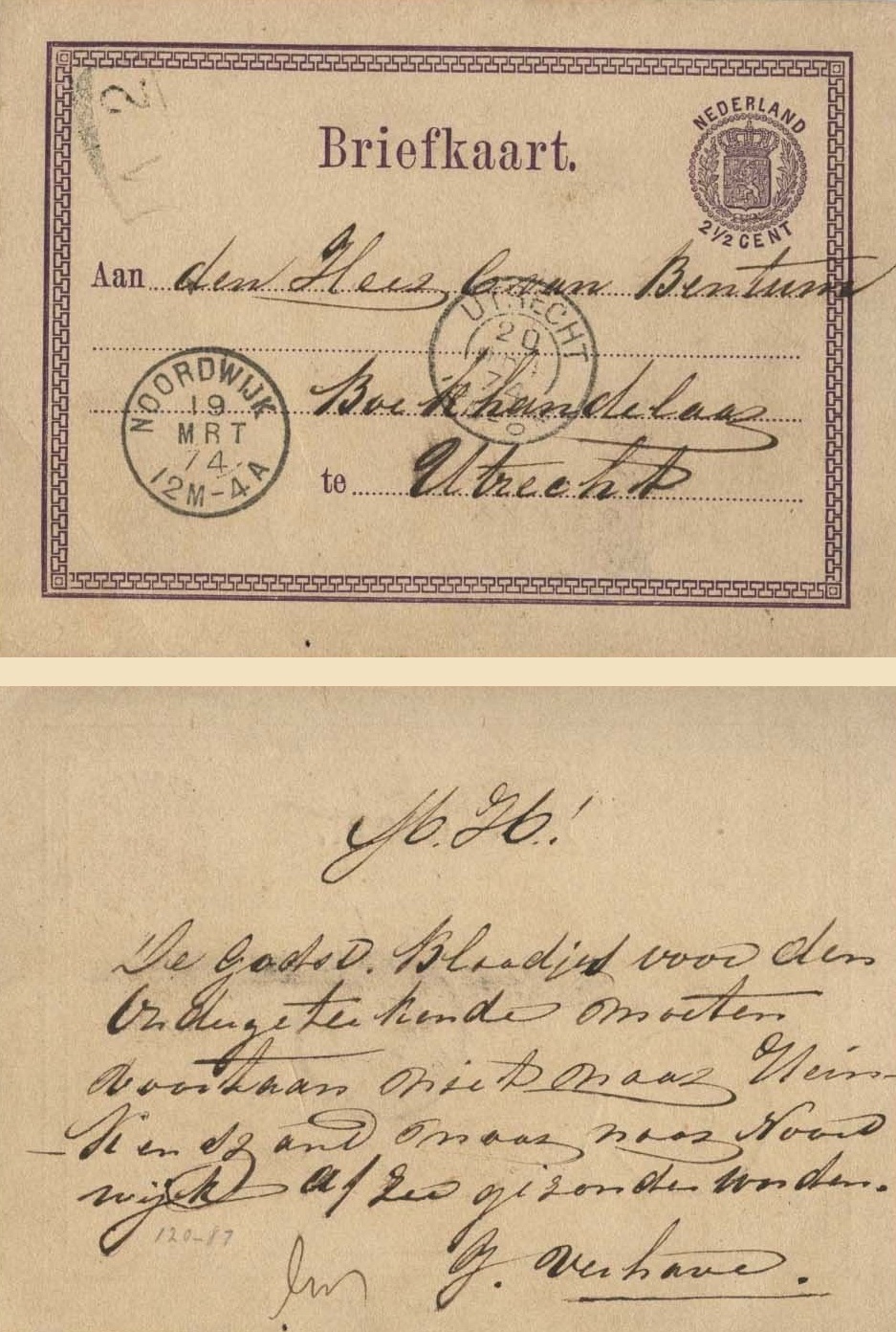 Uncategorized Blog3450: GodsD. Blaadjes Datum: 2 augustus 2012Auteur: Pjotr 0 Reacties Noordwijk, 19 maart 1874 Den Heer C. van Bentum – Boekhandelaar te Utrecht De GodsD. Blaadjes voor den Ondergetekende moeten voortaan niet naar Heinekenszand, maar naar Noordwijk aan Zee gezonden worden. G.Verhave Dit delen: Delen op X (Opent in een nieuw venster) X Share op Facebook (Opent in een nieuw venster) Facebook Vind-ik-leuk Aan het laden... Gerelateerd