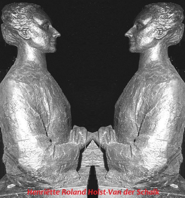 Het beeld van Henriette Roland Holst-Van der Schalk werd onthuld door de oude Willem Drees op 23 december 1969 aan het Lindenplein in Noordwijk-Binnen. Het was vervaardigd door de kunstenaar Bertus Sondaar (1904-1984). Het stond aanvankelijk op de hoek Lindenplein/Voorstraat, zo’n beetje in de achtertuin van Henriettes geboortehuis. Nu staat het aan de andere kant van het plein, meer zichtbaar gelukkig.