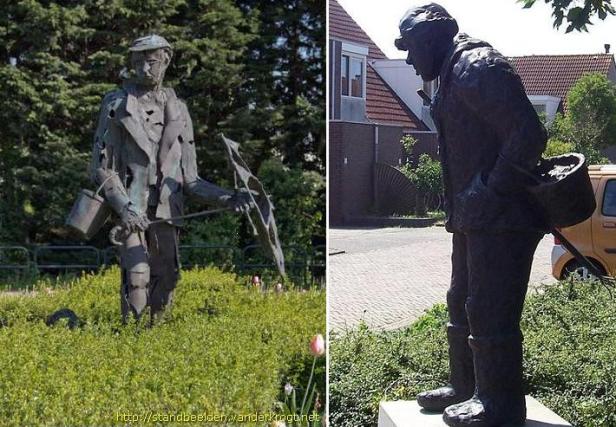 Hierboven twee beelden van een ziekzoeker: links het beeld in Noordwijkerhout, rechts het beeld in Noordwijk. De ene ziekzoeker heeft een stok om het gebladerte opzij te buigen voor nadere inspectie, de ander een paraplu tegen het zonlicht. De één beenkappen, de ander laarzen (dat mocht ook). Zo trokken langzaam lopend (het was een precies en daarom geduldig werkje) door de velden op hun ziekelijke zoektocht. Bijzondere mannen. Vakmensen. Mijn opa was er zo ééntje.