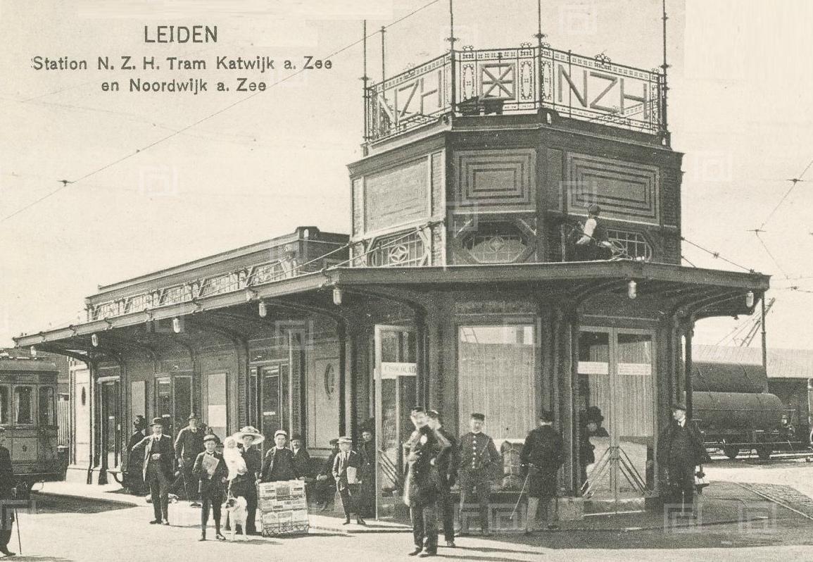 De grap van een tram is dattie 2 eindpunten heeft. De ene, die in Noordwijk aan Zee, hadden we onlangs op de foto staan. Het andere (voorlopige) eindpunt was het station van Leiden. En daar had men – speciaal voor die trams naar Noordwijk en katwijk, een prachtige wachtruimte gebouwd, waaraan de laatste hand nog niet was gelegd (zie de schilder op de luifel). Ook hier: 2x klikken.