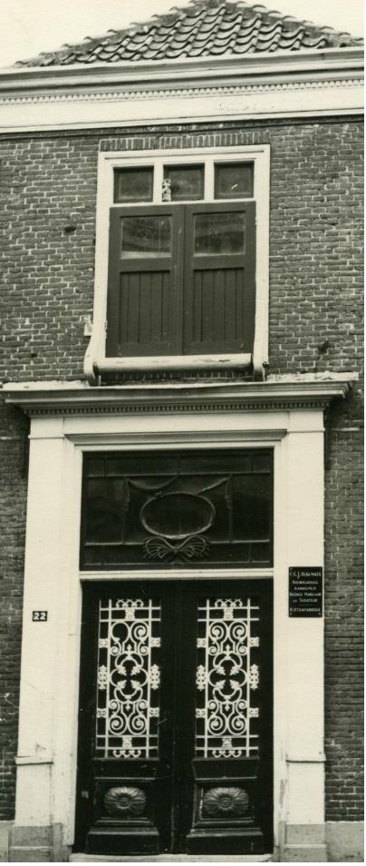 Achter zo’n plechtstatige voordeur zou je van alles verwachten, maar geen timmerwerkplaats. Toch zattie daar. C.G.J. (later L.G.J.) Alkemade had hier de hoofdingang van zijn aannemersbedrijf. Veel daarvan speelde zich aan de achterzijde af, nabij de trambaan. Maar direct achter deze deur was er ook allerhande professionele bedrijvigheid, zoveel is zeker.
