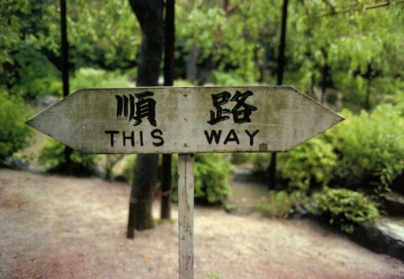 Het andere verhaaltje betreft onderstaande foto waar je in het Engels en het Japans twee kanten op gewezen wordt. Een befaamd bordje dat je – in overdrachtelijke zin gebruikt – wel eens boven iemands bureau ziet hangen of dat je als ansichtkaart naar iemand toe kunt sturen. Ik wist niet dat het bordje echt bestond tot ik ooit belandde in de prachtige tuin van het keizerlijk paleis in Kyoto, Japan: ik kwam aanlopen over een pad en daar stond het: het wees twee verschillende richtingen aan die nergens meer samenkwamen 🙂
