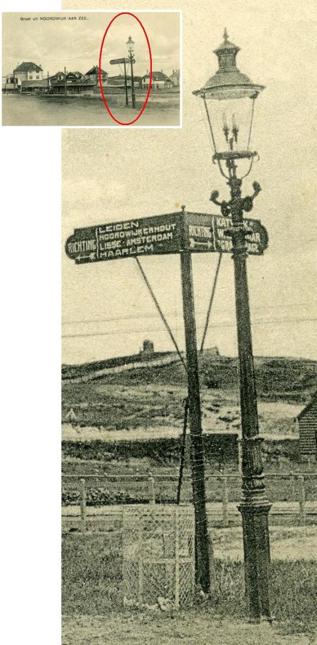 Rond 1920 was de bewegwijzering in Nederland nog niet zo geüniformeerd als nu. Iedere gemeente deed maar wat en het pakte vaak niet eens zo slecht uit. Mooie vormgeving en belettering. Hier bij het eindpunt van de tram aan de Huis ter Duinstraat in Noordwijk aan Zee kon je kiezen tussen de richtingen Haarlem en Amsterdam enerzijds en de richting Den Haag anderzijds. Bij wegwijzers schieten me altijd 2 verhaaltjes te binnen.