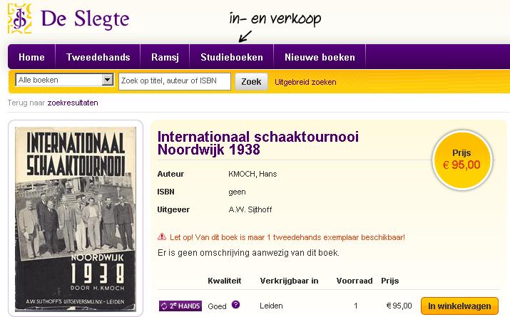 Nu kom ik dit boek weer tegen: een nauwgezet verslag en dito analyses van de hand van Hans Kmoch (volgens nadere info: de man 3e van rechts op de omslagfoto). Uitgegeven in datzelfde jaar 1938 bij Sijthoff in Leiden. Nu antiquarisch te koop voor de lieve somma van € 95. Elders op internet, bij een Engels aniquariaat, kom ik hetzelfde boek tegen voor de som van $ 125. Daar staat ook ter introductie vermeld: Chess interest in 1938 focused on Holland during the month of June. This was occasioned by the Noordwijk International Masters Tournament in which Erich Eliskases of Austria scored a well-merited triumph a point ahead of Paul Keres of Estonia, two points ahead of V. Pirc of Yugoslavia, and in front of Holland’s pride, Dr. Max Euwe, former World Champion.