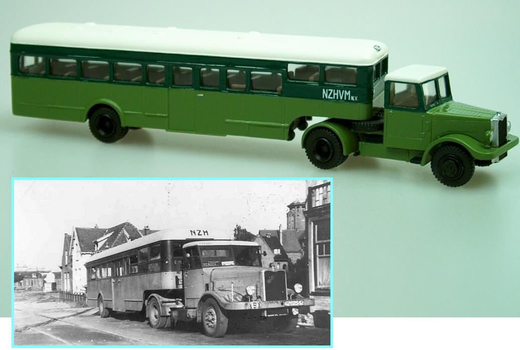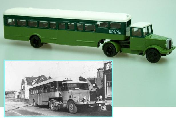 Ik heb ‘m al een tijdlang geleden eens geportretteerd: deze bijzondere ‘bus’ van de NZH, die vanaf 1947 ook zijn rondjes door Noordwijk reed, hier in de Huis ter Duinstraat. Nu kom ik een mooi plaatje tegen van een miniatuur-uitgave van deze truck (gebouwd door Crossley) met oplegger (gebouwd door Fokker en DAF). Zou zo instappen. Je had ‘m trouwens ook in de versie van de Nederlandse Spoorwegen: