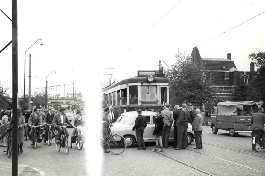 De tram naar Noordwijk kwam niet ver. Even voorbij het Rijnsburgviaduct in Leiden kwam een MercedesW120 van rechts uit de Boerhaavelaan geschoten. Een makkelijke prooi voor een tram van deze allure. Sensatie op de Rijnsburgerweg: studenten en scholieren hielden even in met de fiets, een enkeling bekijkt de autoschade van dichtbij, achter de tram een hele file van andere trams.