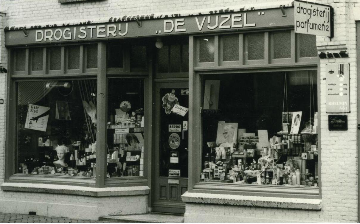 De etalage wekt meer de indruk van een uitdragerij dan van een geciviliseerde showcase. Grotere chaos was er in de Hoofdstratelijke winkels niet aan te treffen (behalve misschien bij J&B). Maar Drogisterij “De Vijzel” voorkwam met zijn zonnecrêmes en –oliën van Nivea en Ambre Solaire (geen aparte factors!) wel dat onze tere kinderhuidjes met brandblaren overwoekerd werden, als we weer eens een dag op het strand hadden gezeten.