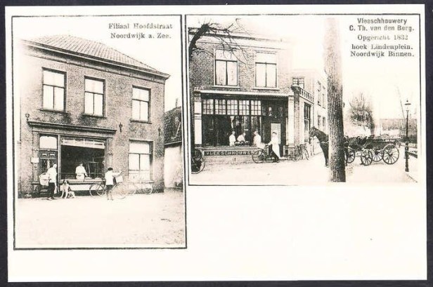De ‘vleeschhouwery’ van C.Th. van den Berg dateerde al van 1832 en dan hattie ook nog een filiaal in de Hoofdstraat op zee. Ik geloof dat ik nog wel een Van den Berg heb meegemaakt in dat pand aan het Lindenplein. Later kwam daar Slager Van den Akker in, gespecialiseerd paardenslager. Mijn grootmoeder was doel op paardenbiefstuk en kocht er iedere zaterdag een flink stuk. Ik vond er niks aan. Ik vond het eigenlijk ook wel zielig voor de paarden (paarden leken mij dichter bij de mensch te staan dan koeien en varkens, wat natuurlijk ook niet waar was). Van den Akker hield later op te bestaan, de winkel stond daarna lange tijd leeg. In het abattoir waar de paardenmoord plaatsvond was later nog een worstenfabriek gevestigd, geloof ik.