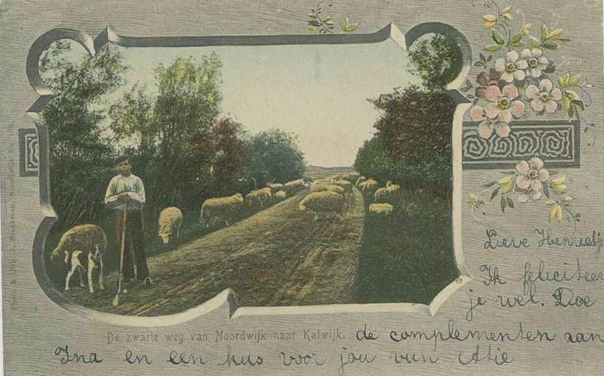 De ‘zwarte weg’ werd op deze kaart niet geschreven als een eigennaam, maar als een werkelijke aanduiding. Waarom de weg ‘zwart’ was, weet ik niet. Omdat-ie naar Katwijk leidde? Vanuit Katwijk zouden ze het de weg naar Noordwijk noemen. Op de foto was er trouwens niet veel zwarts bij. Alleen schapen, kleine kudde. Misschien wel dezelfde kudde als deze.