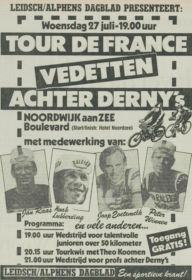 Op 27 juli 1983, zo ongeveer daags na de Tour de France werd het dernycriterium van Noordwijk aan Zee gereden, een officieel door de UCI erkende wedstrijd die in alle wielerdatabases wel terug te vinden is. Toch was het altijd een gemakkelijke wedstrijd, waarvan je nooit het idée had dat het er echt om ging. De winnaar – tenminste dat gevoel had je altijd – stond van te voren vast. Vooral Joop Zoetemelk, geliefd in de streek, was al bij voorbaat favoriet (zelfs alstie niet eens meedeed 🙂 ).