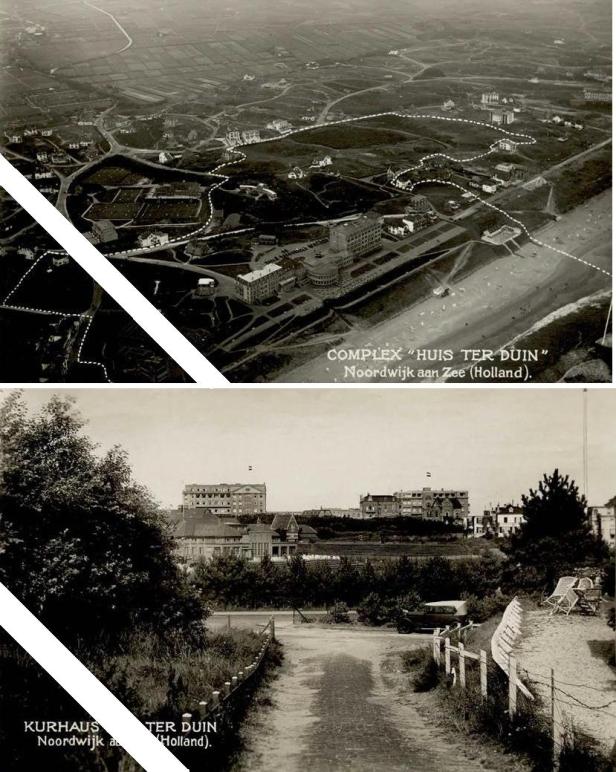 Twee kaarten uit eenzelfde serie. Op de bovenste heeft de directie van Huis ter Duin vol trots het hele godsganschgrote HtD-complex afgebakend, niet schromend om en passant ook maar een stukje strand mee te nemen. Op de onderste foto wordt de suggestie gewekt dat ook de Casino-tennisbanen bij het complex behoorden, quod non. Die suggestie wordt weerlegd in de bovenste foto, waarin de stippellijn is getrokken in een keurige bocht onder Casino door.