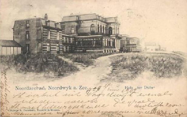 “Ik vertrek uit Noordwijk“, is zo ongeveer het enig leesbare op de kaart, evenals de datum: 19 juni 1907. De kaart houdt het midden tussen een foto en een tekening. Links staat een provisorisch, houten gebouwtje. Een bouwkeet ten behoeve van wéér een nieuwe uitbreiding van Huis ter Duin?