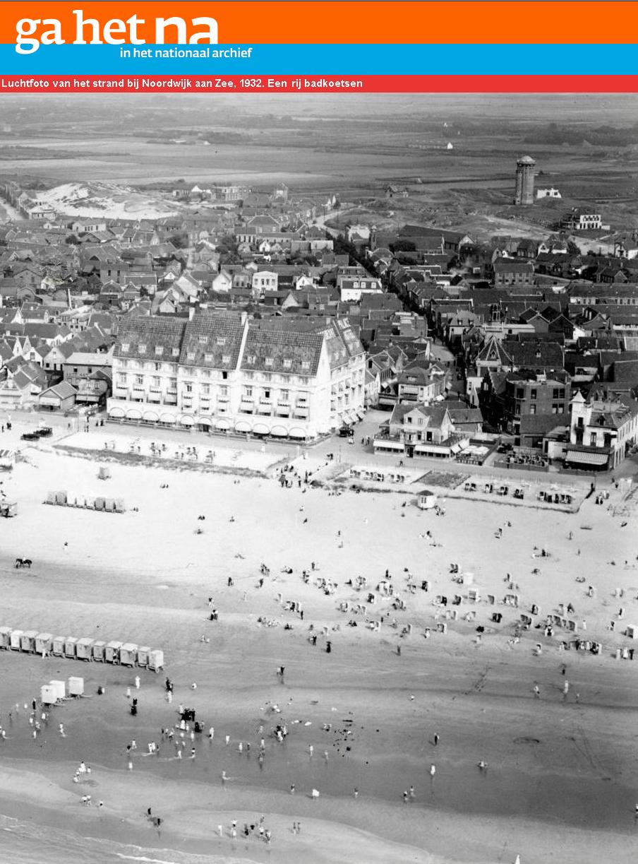 Er is veel te zien op deze foto, als je er maar goed naar wilt kijken (2x klikken en je ziet het beter). De lage terrassen tussen strand en boulevard, het parkeerterrein en de prachtige kiosk van Dorsman. Maar ook: de rijen badkoetsen die in ieder geval na 1912 (bouw Palace Hotel) nog steeds dienst deden. De foto is volgens het Nationaal Archief van 1932, maar of badkoetsen toen ook nog dienst deden, betwijfel ik. En waar moeten we die grote hoop zand plaatsen? Is dat het vermaarde ‘Stijntjesduin’, of gaat het al over de nog aan te leggen Quarles heen? De ‘Elf Huizen’ links achterin naast de watertoren?