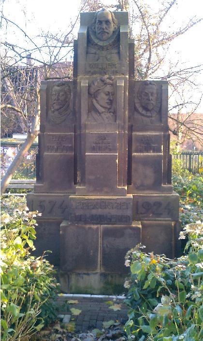 Dit monument herdenkt de 350e verjaardag van Leiden’s Ontzet op 3 oktober 1924. Op die dag werd dit monument, op de hoek van Geregracht en Plantsoen in Leiden, onthuld door Koningin Wilhelmina. Het monument draagt de beeltenissen van drie grote helden uit de Leidse geschiedenis rond het Ontzet: Prins Willem van Oranje, Jan van Hout, Jan van der Does, oftwel Janus Dousa en Louis Boisot.