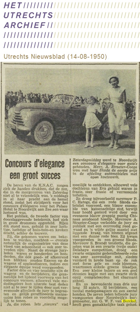 Vrijwel geen woord over die prachtige auto op de foto, blijkbaar het eigendom van mevrouw A. Straeter-Coops. Het was een groene Skoda 1102 Roadster uit 1950, een beauty van een auto. Skoda was toen blijkbaar nog een hip merk, maar zou kort daarna grotendeels achter het IJzeren Gordijn verdwijnen om er tegenwoordig weer achter te voorschijn te komen, verkleed als Volkswagen.