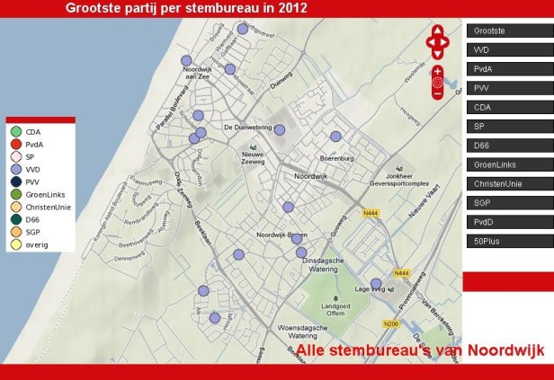 NRC/Handelsblad heeft een mooie gimmick: voer een postcode in op een kaart en je krijgt van iedere plaats of zelfs wijk alle stembureau’s naar boven met daarbij aangegeven welke partij in dat stembureau de grootste was. In Noordwijk was de VVD in alle stembureau’s de baas.