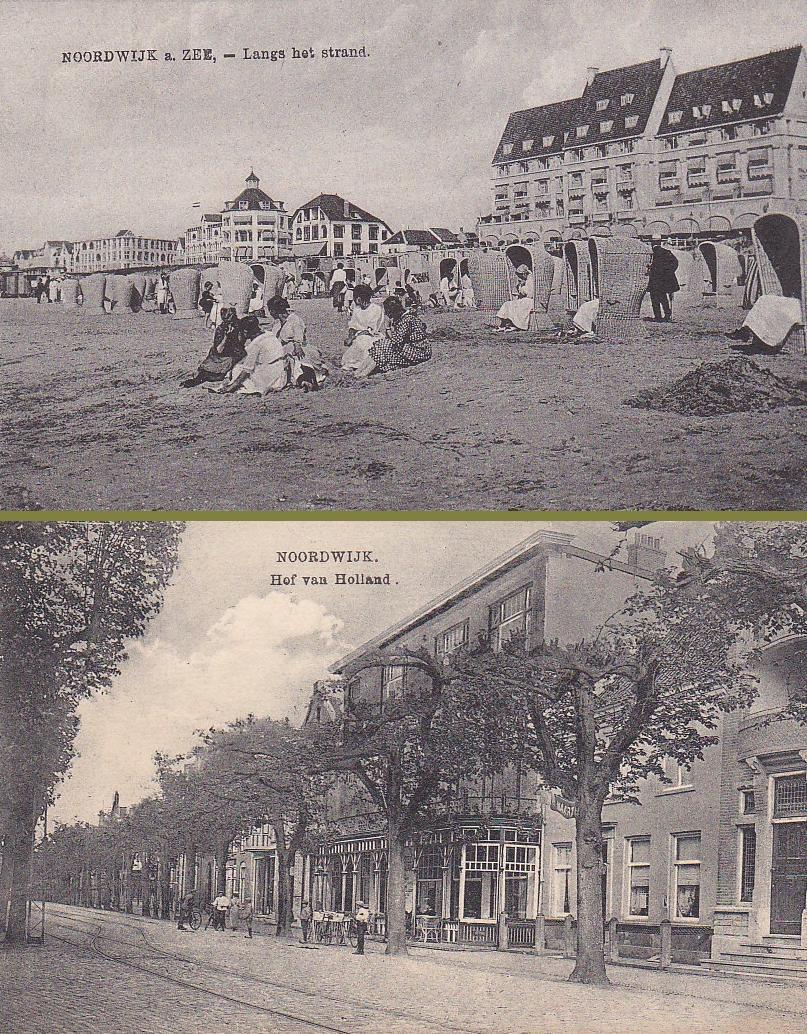 Korrel van de foto’s en belettering doen vermoeden dat het hier om beelden gaat uit ongeveer dezelfde tijd. Twee, wat mij betreft, iconische Noordwijkse gebouwen en daarom zet ik ze ook bij elkaar: het Palace Hotel aan de Noordboulevard en het aloude Hof van Holland aan de Voorstraat.