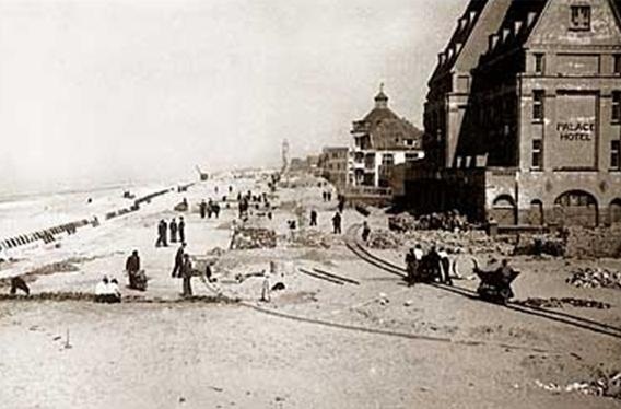 De foto is van na de oorlog. Er is een spoorlijntje aangelegd om het zand af te voeren dat hier nog de Atlantik Wall omsluit. Nadat de boel uitgegraven was, zou de muur voorover gekieperd worden en weer met zand toegedekt. Hij moet er nog steeds liggen, die Atlantik Wall. Dat spoorlijntje hadden ze eigenlijk moeten laten liggen. Had de tram zomaar tot aan de boulevard door kunnen rijden, nog steeds een opwindende gedachte.