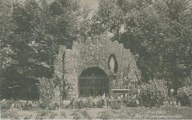 In het St.Jeroensgesticht moeten ze gedacht hebben: als Mozes niet naar de berg komt, komt de berg wel naar Moses. De oudjes waren niet meer in staat, blijkbaar, om een reis naar Lourdes te maken, om daar ter bedevaart Maria te eren. Dus kwam Maria met haar Lourdese grot en al naar de tuin van het gesticht in Noordwijk.
