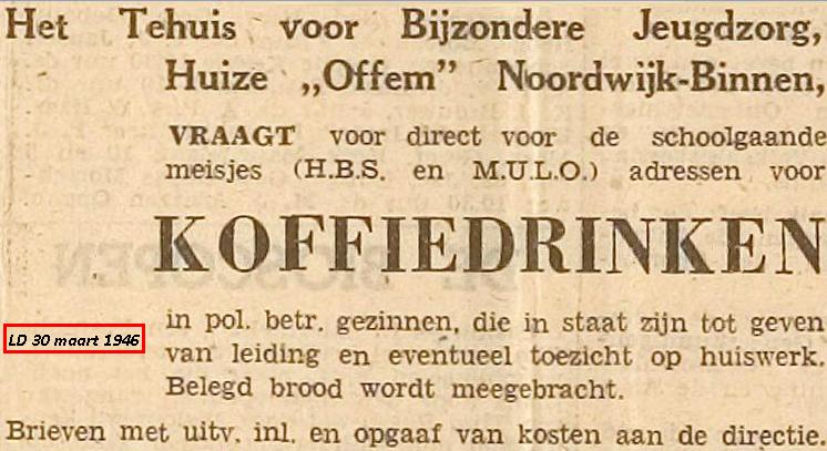 Het staat er zo mooi: “Tehuis voor Bijzondere Jeugdzorg, Huize Offem te Noordwijk-Binnen”. In werkelijkheid was het een opvangtehuis voor kinderen van ‘foute ouders’, die na de oorlog elders werden geïnterneerd. Het ging bij ‘Offem’ om de dochters. De zonen werden ondergebracht in Huize Jeroen aan de Wilhelminastraat (nota bene nadat daar eerst nog hun ‘foute ouders’ waren ondergebracht).
