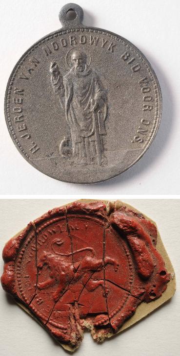 Nog twee artefacten uit de rijke verzameling van Museum ‘De Lakenhal’ in Leiden: een penning van eind 19e eeuw ter herinnering aan een bedevaart naar de H. Jeroen in Noordwijk. En een afdruk van een lakstempel met het wapen van de gemeente Noordwijk erin.