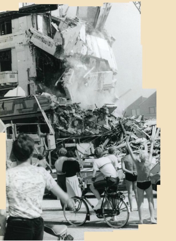 Het is een foto waar ik met droge ogen niet naar kijken kan. De afbraak van het vermaarde Palace Hotel aan de Noordboulevard. Het onderschrift situeert de foto in 1981. Dat zou enkele jaren na de fatale brand (december 1978) zijn geweest en het suggereert dat de resten er nog meer dan twee jaar hebben gestaan. Dat kan ik me niet herinneren.