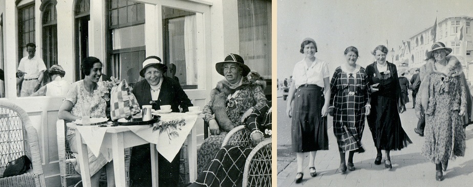 Nog twee foto’s uit het Dorsman-album van Gill: links een groepje vrouwen op het terras van Hotel Pension Noordzee. Rechts een groepje vrouwen wandelend op de boulevard met Hotel Pension Hollander op de achtergrond. Twee verschillende foto’s en twee verschillende groepjes vrouwen (?). Behalve dan die mevrouw rechts met die curieuze hoed en al dat bont om haar nek en schouders: dat is onmiskenbaar één en dezelfde persoon.