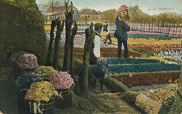 De afbeelding kan stammen uit de hele Bollenstreek en dus ook uit Noordwijk. Of dat hier het geval is, durf ik niet hardop te schrijven, want daarvoor zijn er te weinig indicatoren beschikbaar. De huizen op de achtergrond, de bomen, de ‘K’ op de manden: het is allemaal te weinig.