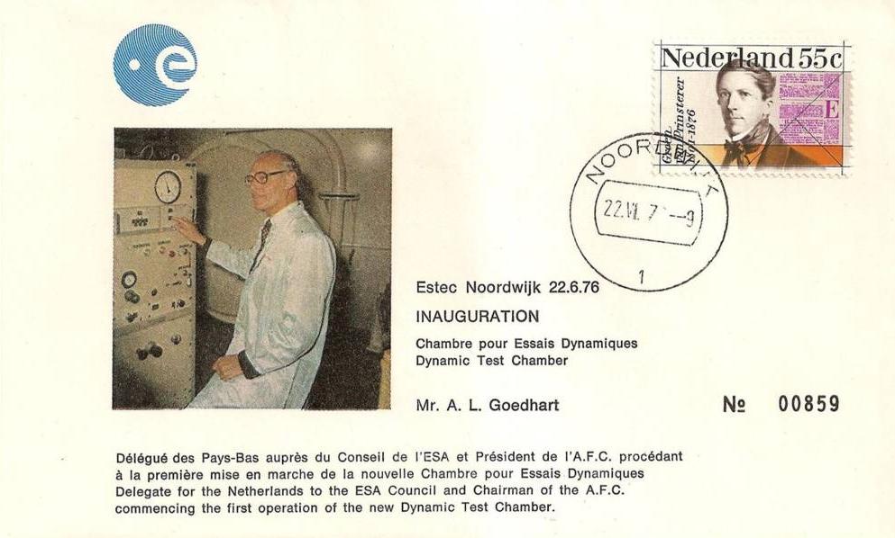 De postzegelvereniging van ESTEC Noordwijk is altijd zeer bedrijvig geweest bij de uitgifte van speciale enveloppen ter herinnering van dit of dat. Zelfs de in gebruik name van een nieuwe ‘Dynamische Test Kamer’ op 22 juni 1976 mocht niet ontsnappen aan de aandacht van iedere rechtgeaarde filatelist en dus werd er weer een envelop tegenaan gegooid, dit keer met de beeltenis erop van A.L. Goedhart, officieel Nederlands gedelegeerde bij de Raad van de Europan Space Agency en voorzitter van het Administrative and Finance Committee van diezelfde Space Agency.