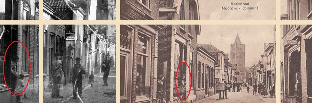 Noordwijkse Villa’s komt vandaag met de linkerfoto en identificeert de vrouw in de deuropening als de vrouw van slager Van der Horst, die daar zijn nering dreef. Ik kom tegelijk op qoop.nl de rechterfoto tegen van een paar jaar ouder: de galmborden in de toren van de oude St.Jeroen hangen links nog hoog en de klok hangt laag. Dat zou later omgedraaid worden. En op de rechterfoto is ook sprake van grotere mobiliteit, al zijn het dan allemaal fietsen.