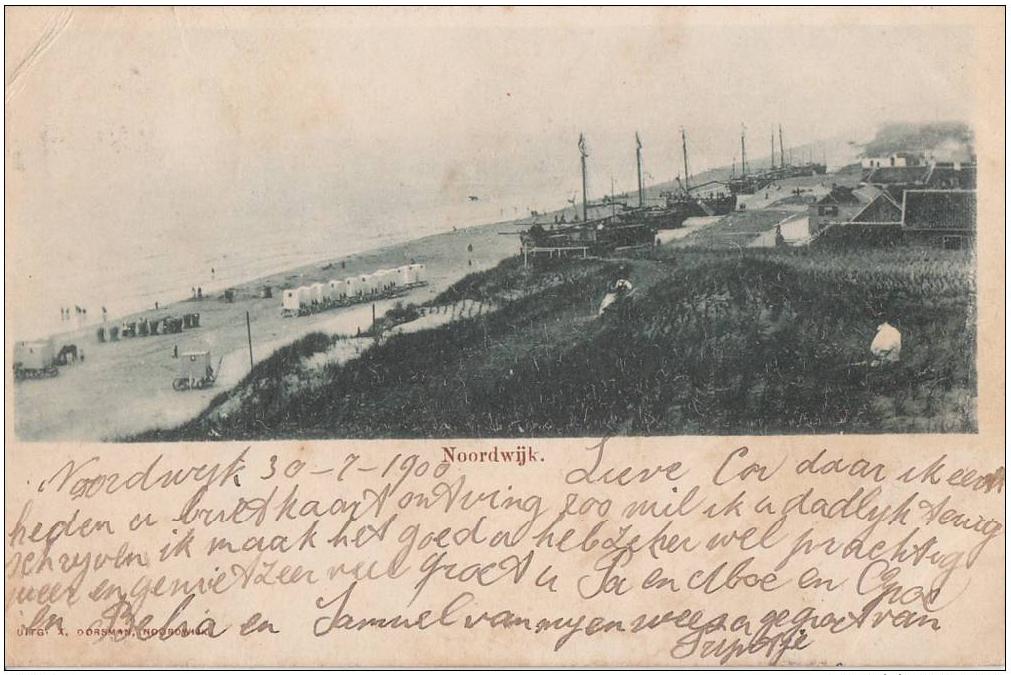 De kaart is van 30 juli 1900 en toont Noordwijk in twee gedaanten: als badplaats (badkoetsen) en als vissersplaats (bommers). Daarmee is zo ongeveer ook de kanteling aangegeven in de tijd, want de badkoetsen zouden vanaf dan steeds verder oprukken en de bommers langzaam verdwijnen. De mededelingen op de kaart zijn wat dat betreft nietszeggender dan de afbeelding: