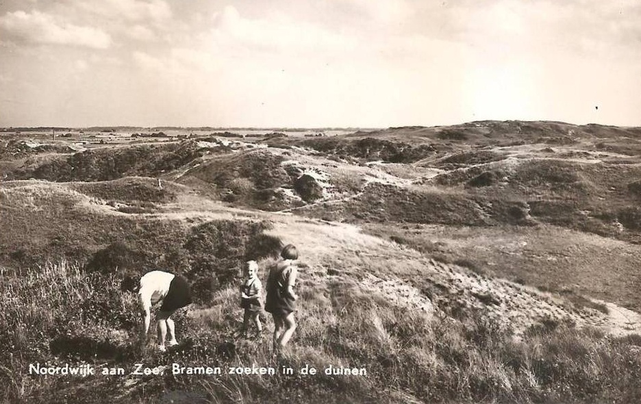 Deze kinderen zijn hun blackberries kwijt en ze zijn ze hier in het duin aan het zoeken. Dat staat althans in het bijschrift: “bramen zoeken“. Ik deed daar nooit aan mee. Wij hadden een paar bramenstruiken achter in de tuin staan die altijd uitbundig bloeiden. Bij ons groeiden de ‘blackberries’ aan de struiken achter het huis. Iedere zomer, iedere dag gele vla met bramensap. Tot het je strottehoofd uitkwam.