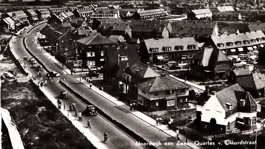Als je er liep, viel het nooit zo op: die prachtige bocht die er ligt in de Quarles van Uffordstraat, zeker vanaf dit standpunt genomen. Het maakt ‘de Quarles’ eigenlijk tot één van de mooiste grotere straten van Noordwijk. Was die bocht er niet geweest, dan was de straat even saai en inspiratieloos geworden als de ‘Van Panhuys’ en de ‘Van de Mortel’, om over de ‘Van Berckel’ maar te zwijgen.