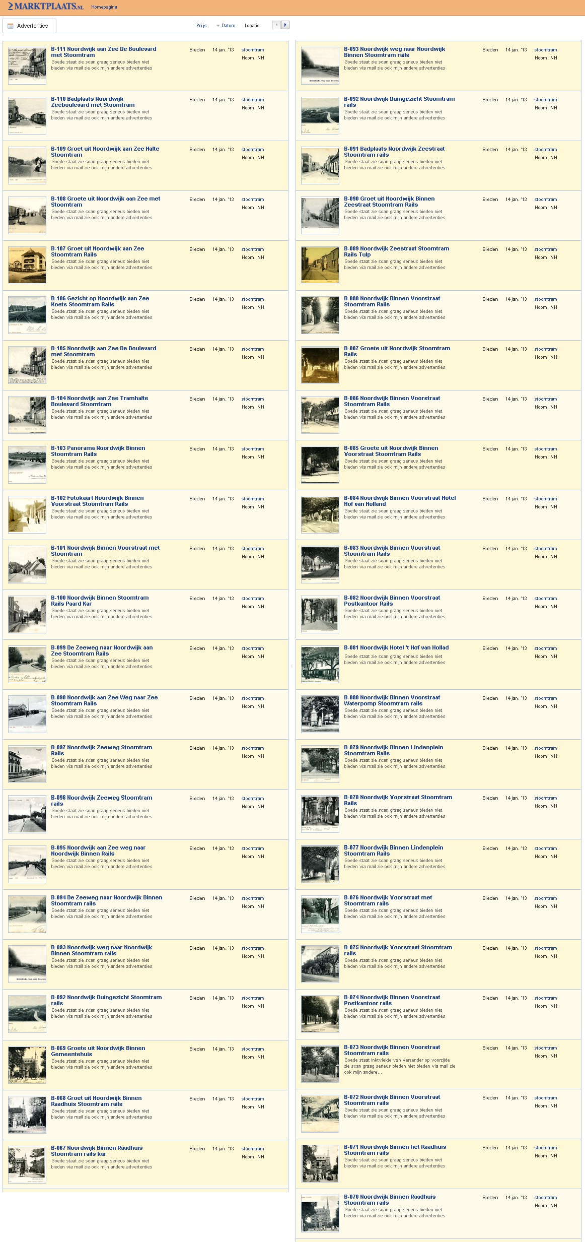 Iemand biedt op marktplaats.nl een waanzinnig mooie en uitputtende serie foto’s aan van de stoomtram in Noordwijk. Bijna iedere kilometer die het ding hijgend en puffend door Noordwijk trok is hier met fotografische precisie gedocumenteerd. Een aantal ervan heb ik hier in dit blog ook gebruikt. Maar de serie als geheel is het indrukwekkendst van al.