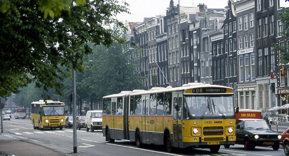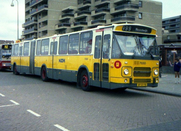 Een tijdje geleden hadden we een dubbelgelede bus aan de hand.Een bus in drie delen met twee harmonica’s ertussen. Een apparaat dat in Noordwijk wel nooit gereden zal hebben. Of dit exemplaar – een enkelgelede bus – ooit op een lijndienst in Noordwijk gereden heeft, weet ik niet. Hier staat hij wel geparkeerd op de boulevard, maar met het redelijk fantasierijke nummer 999 en met een HTM-of GVB-bus aan zijn staart, geen logische combinaties voor een eenvoudige Noordwijkse lijnbus. Maar goed, hij wás er wel en hij wás mooi! Een ‘slingerbus’ noemde mijn oudste zoon dat vroeger. Hieronder nog een foto van dezelfde bus. Ik denk op de Rozengracht in Amsterdam, misschien de Prins Hendrikkade.