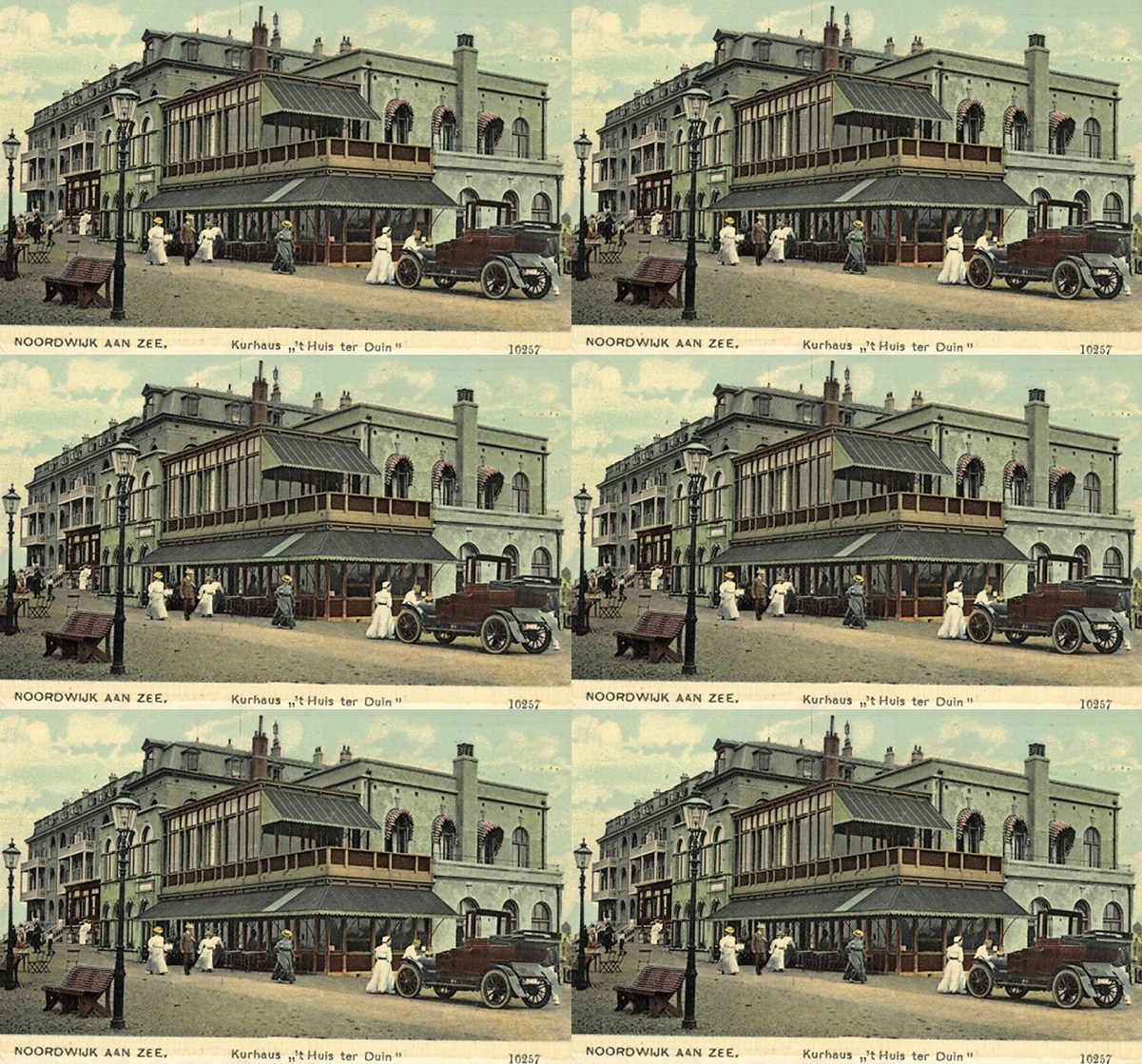 De foto is van een verblufende schoonheid, maar dat komt ook wel door de wat losvaste hand, waarmee die is ingekleurd. Sommige onderdelen wél, andere niet. Dames in lange, witte zomerjaponnen, een eerste automobiel, twee gaslantaarns. Kurhaus “’t Huis ter Duin”.