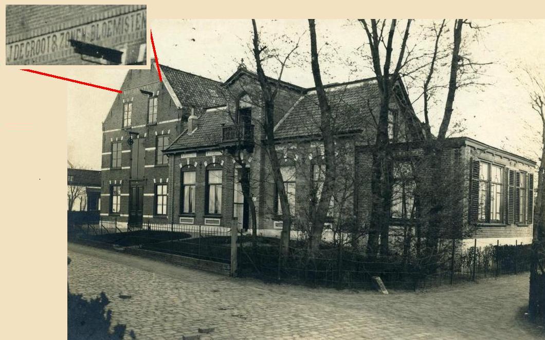 Maar daarvoor was dit complex in eigendom van “J. (Jacob) de Groot & Zonen, Bloemisten”. Die naam was keurig ingebeiteld op een steen in de voorgevel van de schuur. Maar de schuur is er niet meer, afgebroken ten behoeve van de bouw van enkele doorzonwoningen van de frisse soort. Jammer. Zo’n steen was iets geweest om te bewaren.