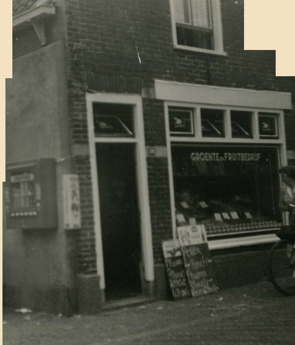 Het rook er altijd naar verse groenten in dat winkeltje. Ik herinner me vooral de zuurkool uit het vat en soms ook de vers gekookte bieten. Geconserveerde groenten in blikken van ‘De Sleutels” uit leiden. Ik weet niet meer wat er in die automaten zat ter linkerzijde. De peren deden overigens volgens het bord voor de winkel één gulden per vier pond. En voor dezelfde prijs had je drie pond pruimen. Kom er nog maar eens om.