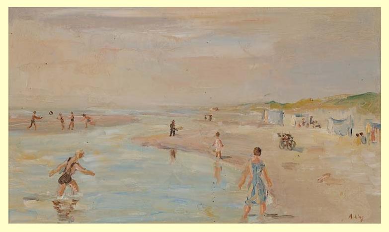 De van oorsprong Brabantse schilder Fik Abbing (1901-1955) was een veelzijdig kunstenaar, die tal van verschillende technieken gebruikte in zijn werk. Zie hier een overzicht van zijn werk. Zijn aquarellen vind ik persoonlijk het allermooist, maar dit olieverf op doek mag er ook zijn: “Strandgezicht in Noordwijk” (ongedateerd). Het schilderij is eigendom van het Museum Henriette Polak in Zutphen.