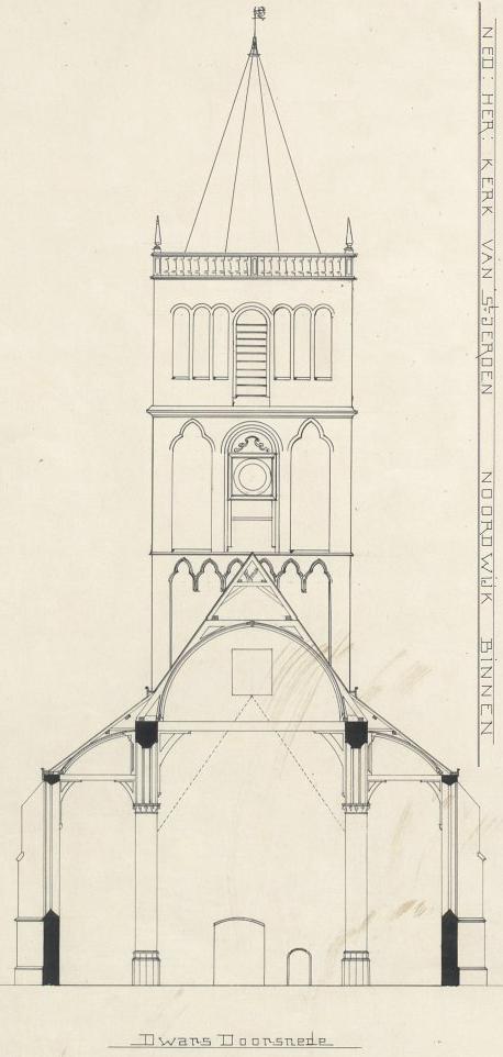 De Rijksdienst voor het Cultureel Erfgoed in Amersfoort beheert een beldbank met tal van prachtige monumenten erop. Ook uit Noordwijk. Deze tekening geeft een bouwkundig beeld van de toren van de Hervormde Kerk van Noordwijk Binnen. Of eigenlijk: de toren van de Gemeente Noordwijk, die vastzit aan de Hervormde Kerk in Noordwijk Binnen. Want bij mijn weten is de kerk eigendom van de hervormde gemeente en de toren van de gewone gemeente. Zoiets.