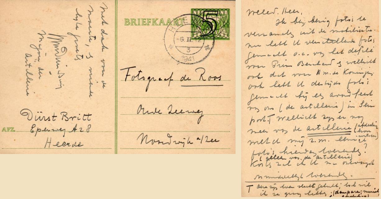 Weledele Heer, Ik ben bezig foto’s te verzamelen uit de mobilisatie. Nu hebt U verschillende foto’s gemaakt o.a. van het defilé voor Prins Bernhard & wellicht ook dat voor H.M de Koningin. Ook hebt U destijds foto’s gemaakt bij een avondfeest van ons (de artillerie) in Seinpost. Deze zijn toen slecht gelukt; toch wil ik ze graag hebben (dansparen, muziekgezelschap). Wellicht zijn er nog meer van de artillerie( afdeeling houwitzers). Wilt U mij z.m. eenige foto’s hiervan toezenden (alleen van de artillerie). Kosten zal ik U na ontvangst onmiddellijk toezenden. Met dank voor de moeite & vriendelijke groeten.
