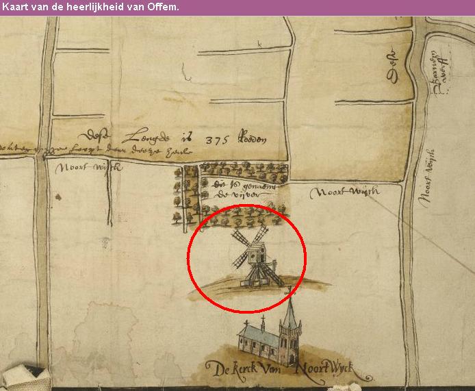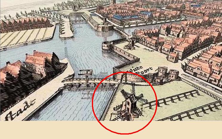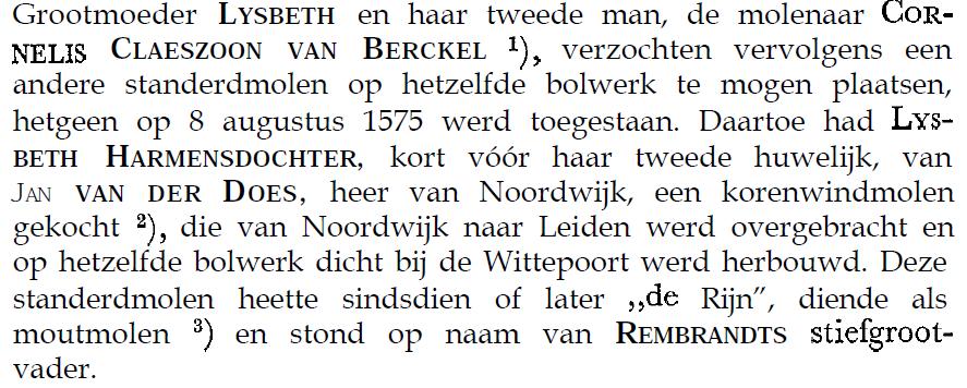 A.Bicker Caarten schrijft in het Leidsch Jaarboekje 1956 een doorwrocht artikel over de molen “De Rijn” die jarenlang naast de Witte Poort heeft gestaan in Leiden, op de hoek van de tegenwoordige Witte Singel en Noordeinde. Bovenstaand fragment komt uit dat artikel. De molen was afkomstig uit Noordwijk, ook al is niet altijd even duidelijk wélke molen dan uit Noordwijk naar Leiden was overgebracht. Ook al op basis van een doorwrocht artikel van Herman Schelvis in De Oude Dorpskern ga ik voor de zgn. ‘Zuydmolen’ die aan het begin van het Landgoed Offem heeft gestaan. Vandaar werd het ding overgebracht naar Leiden, waar de opoe van Rembrandt van Rhijn himself er mout mee ging malen. Rembrandts vader moet er ook nog in gewerkt hebben, evenals zijn broers. Rembrandt zelf werd geboren aan de Weddesteeg in Leiden, niet meer dan zo’n 100 meter verderop. Op een prent van Blaue is de molen nog zichtbaar nabij de Witte Poort in Leiden.