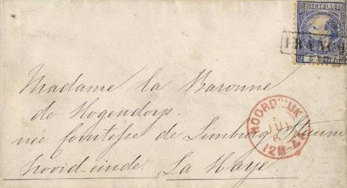 De brief is van juli 186… en dat is – philatelistisch gezien – een tijd terug. Afgaande op de postzegel: dat is één van de eerste nummers uit de NVPH-catalogus. Een emissie uit 1867, dus de brief kan op zijn vroegst vanaf dat jaar worden gedateerd (en niet in 1864, zoals verkoopsite delcampe.net beweert). Maar ook dat zoeken we nog met meer precisie op. De hele boel is te koop voor een bod vanaf €10, maar alleen de zegel al is volgens mij het drievoudige waard.