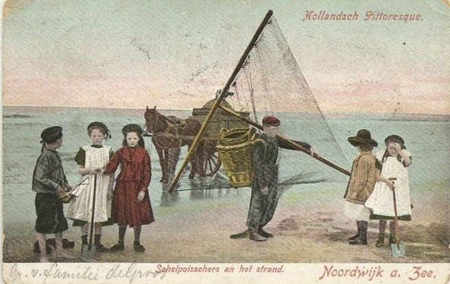 Of dit beeld nu werkelijk zo ‘Hollandsch Pittoresque’ was? Ik heb er wel een paar vraagtekens bij. Maar als je gaat googelen op die term, kom je er al snel achter dat het hier ging om een hele serie ansichtkaarten van verschillende plekken in Nederland, die allemaal onder de verzamelnaam “Hollandsch Pittoresque” rond 1900 werden uitgegeven. Zo ook deze dus, van een ‘schelpvisscher’ (volgens mij heeft-ie een garnalennet over zijn schouder) ‘an’ het strand.